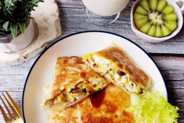 把鴻喜菇炒蛋和起士片一起用市售蛋餅皮包成盒子,煎好後就是香噴噴又營養美味的早餐🍴是一道大人小孩都非常喜歡、常常會想吃的簡單料理🍄