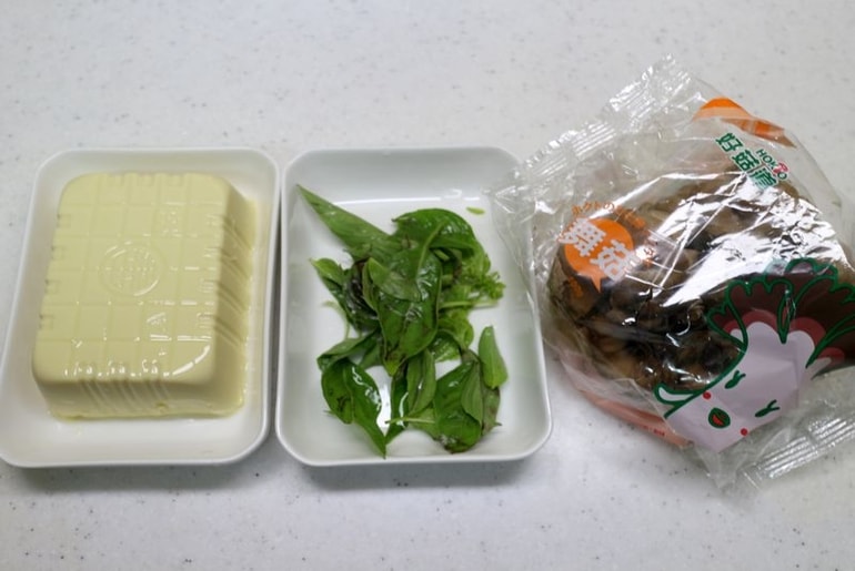 步驟1.準備材料: 雞蛋豆腐切塊,九層塔去梗,舞菇打開包裝不需清洗直接撥散