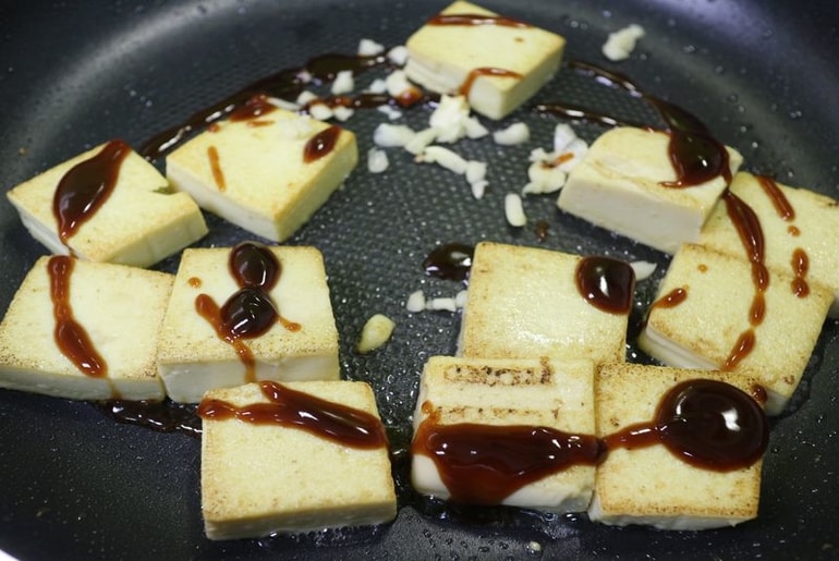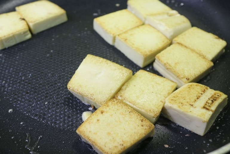 步驟4.少許的油煎香雞蛋豆腐,煎到雙面金黃