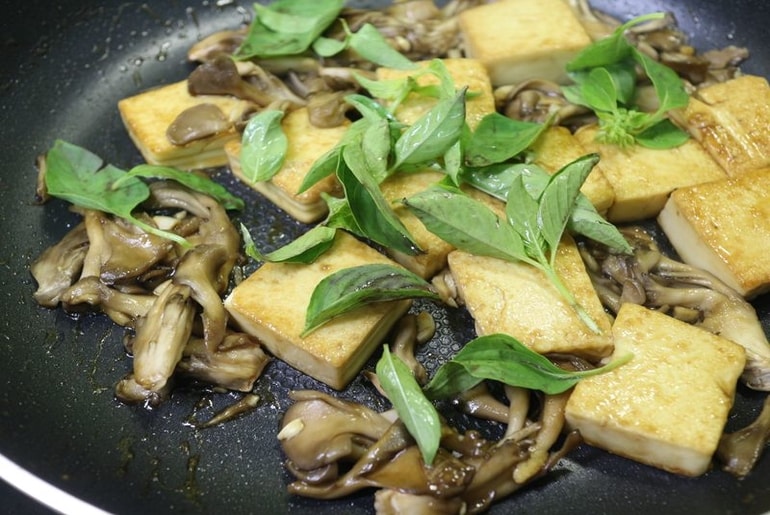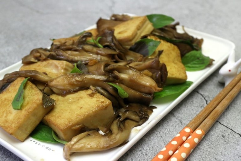【蠔油塔香舞菇蛋豆腐】是一道很香的料理唷,蠔油醬香,還有最後起鍋前的九層塔香,把煎赤赤的雞蛋豆腐和舞菇都煮得好好吃~超下飯!不油不膩超美味~