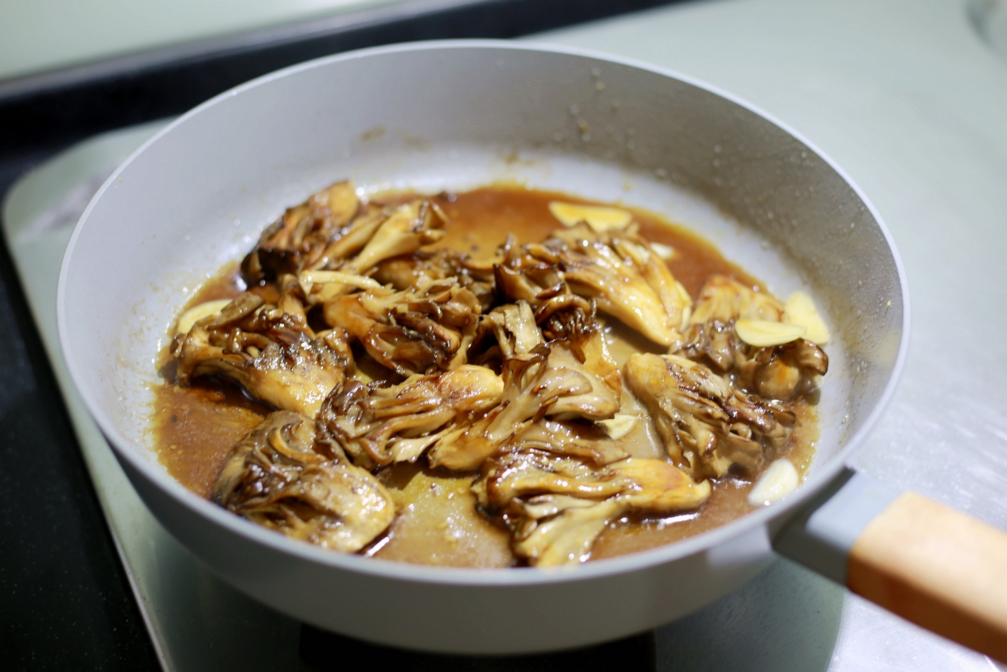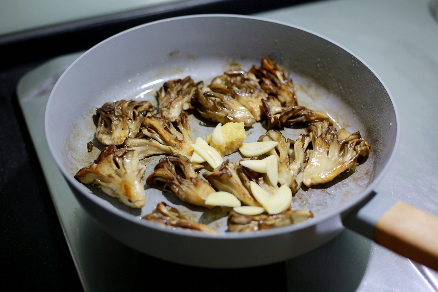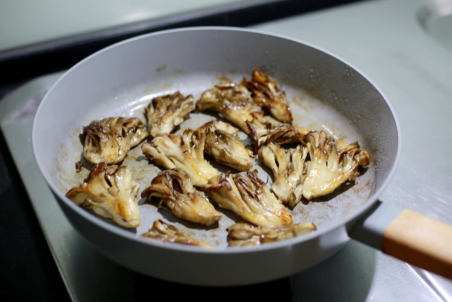 熱鍋加入1大匙食用油,先將舞菇煎成雙面金黃。