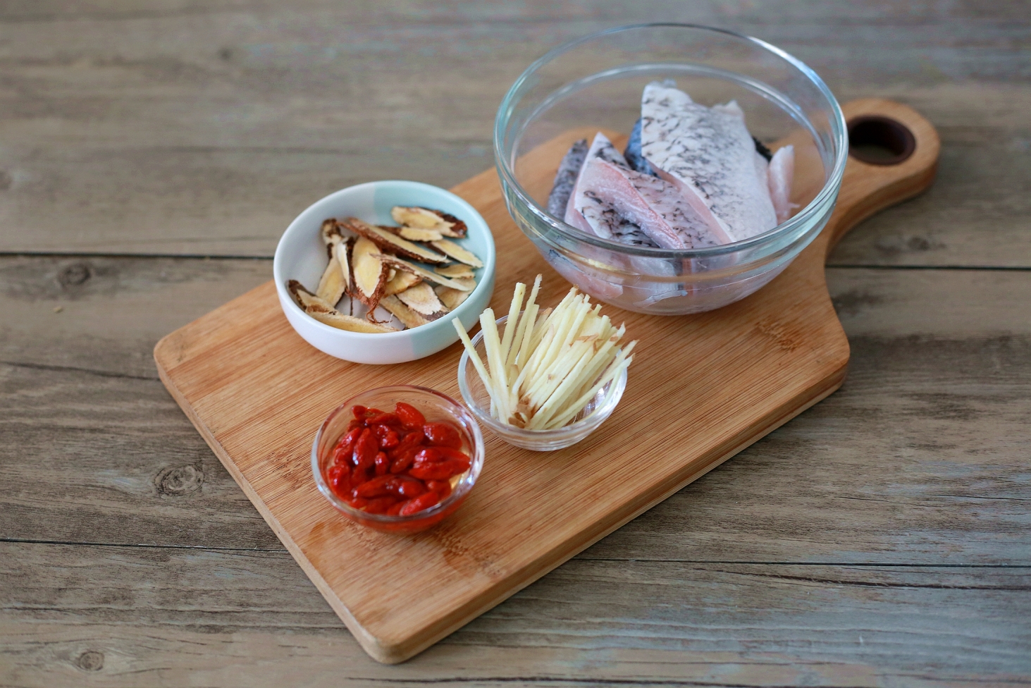 黃耆、枸杞清水快速沖淨瀝乾,枸杞加一點米酒浸泡變軟,薑切絲,魚片切大片狀並加一小匙米酒及一點點鹽抓醃備用。