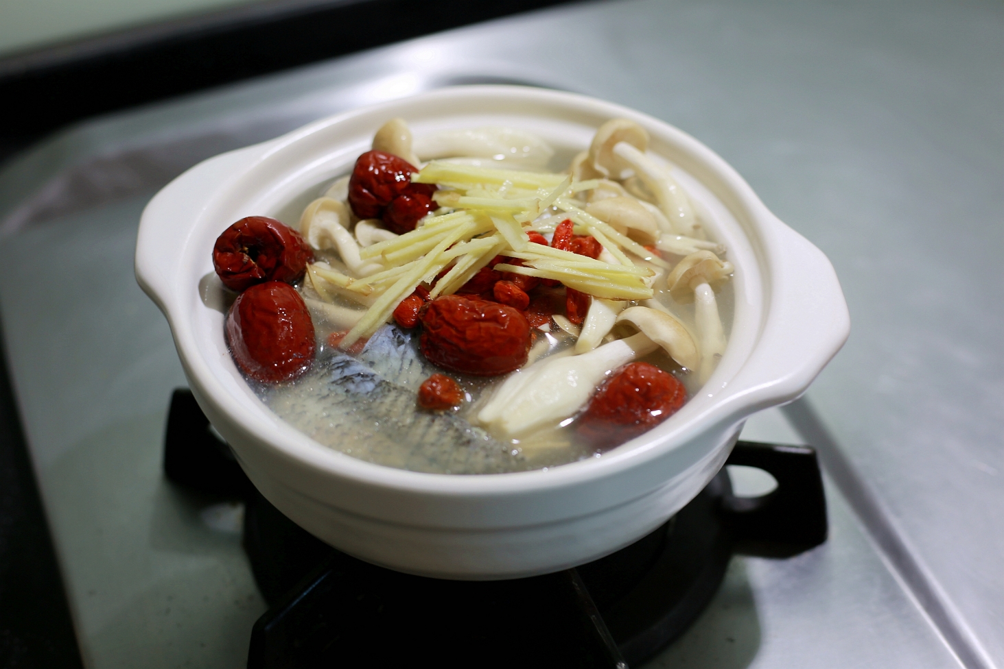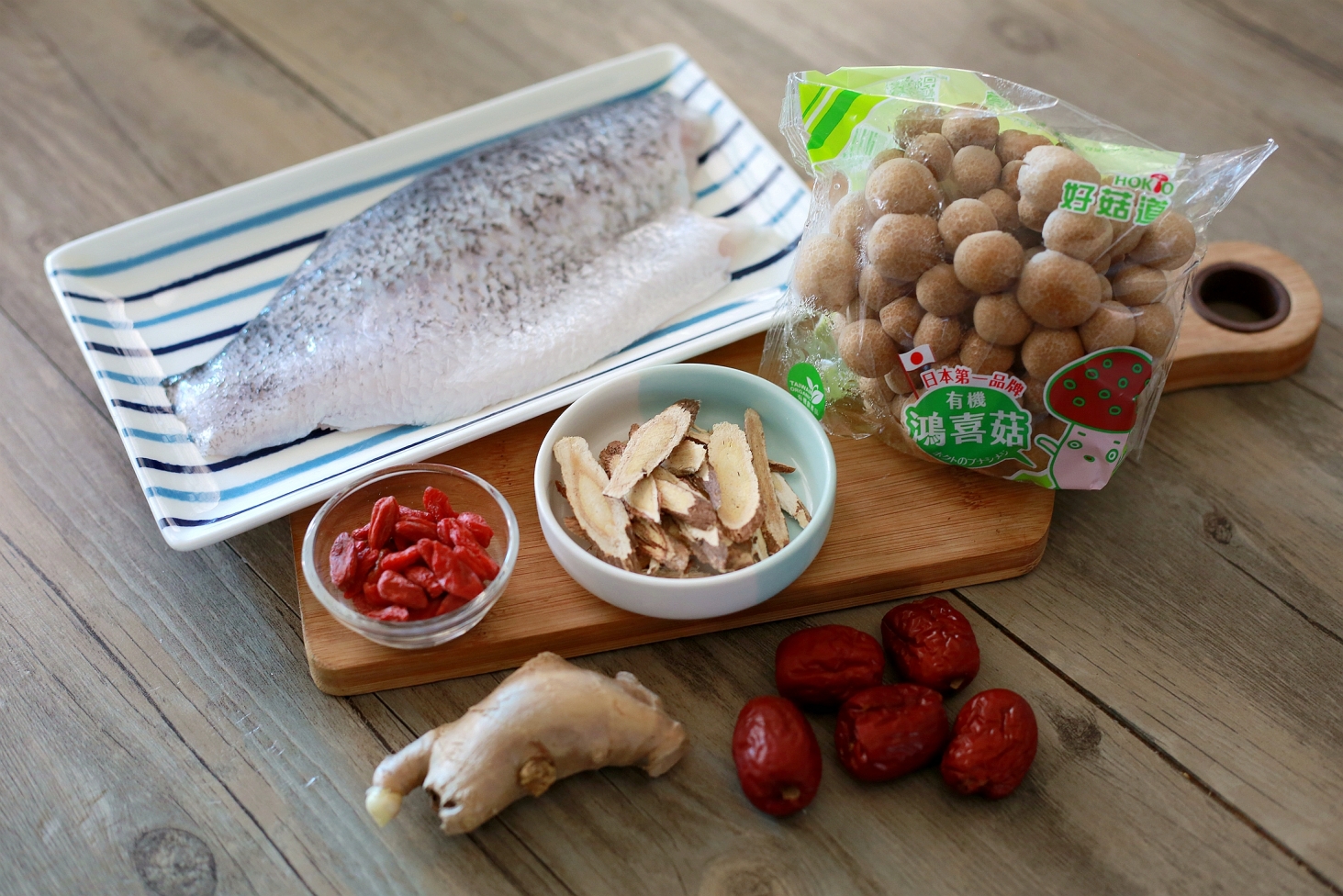 接著放入魚片、鴻喜菇、枸杞、米酒及薑絲加蓋中小火悶煮。
