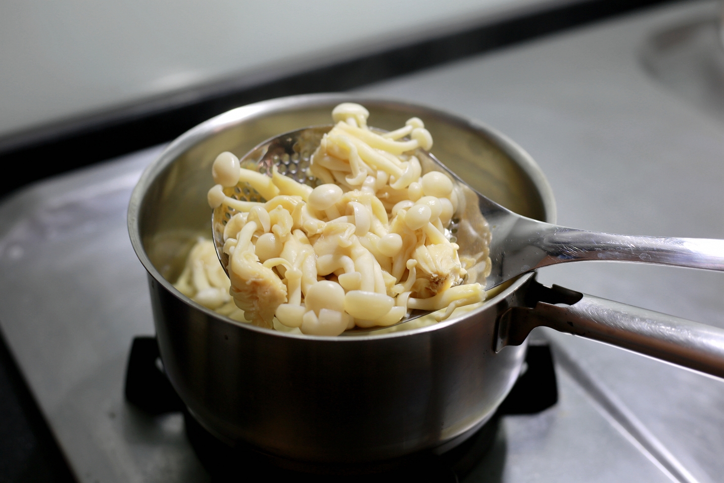 撈起雪白菇濾乾水份。