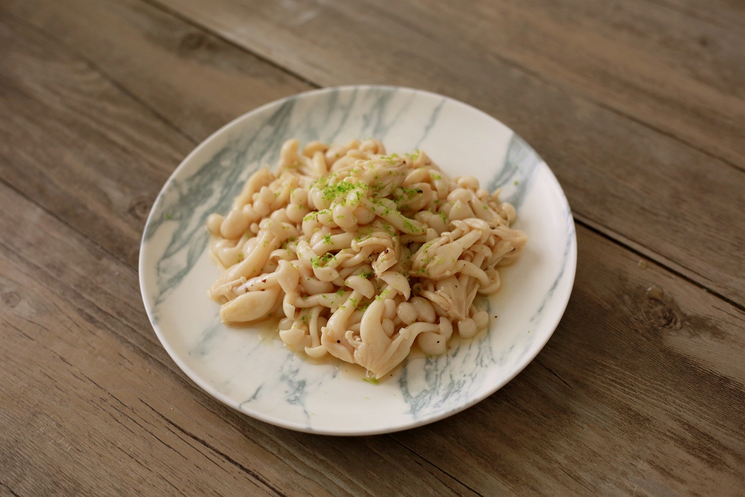再將燙熟的雪白菇與檸檬醬汁混合均勻,等待30分鐘後入味即完成。