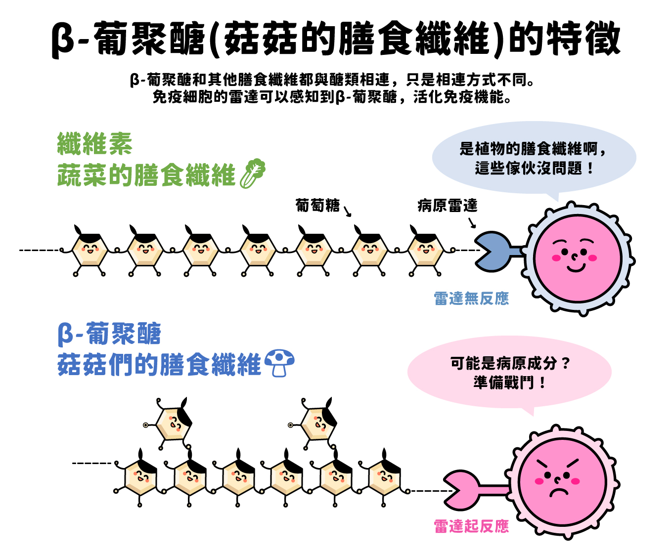 免疫細胞擁有可以感應到病原的雷達(模式識別受體),包含病毒遺傳基因雷達、細菌成分雷達等……,其中一種就是β-葡聚醣雷達(Dectin-1)。也就是說,β-葡聚醣擁有可通知免疫細胞「可能有病原入侵!」的特徵,這是植物纖維所沒有的特徵。