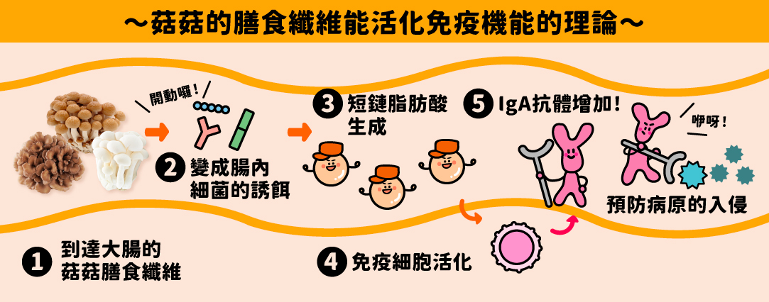 雖然菇類的膳食纖維本身只能到達腸道的免疫細胞,但是藉由活化腸道的免疫細胞,能讓全身的免疫機能提升。在後疫情時代,為了維持健康、更自由地生活,不妨讓菇類協助鍛鍊、強化免疫細胞,在健康上助你一臂之力吧。