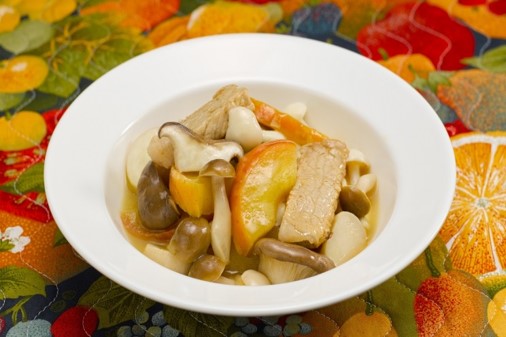將鴻喜菇、雪白菇底部切除剝開,杏鮑菇1公分左右切滾刀,肉片3公分切,蘋果切小片。
